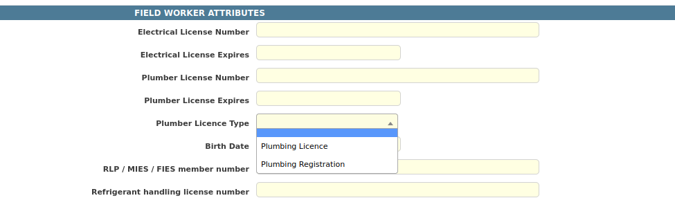To limit the list of Fieldworkers shown we have added a new Fieldworker Attribute called Plumber Licence Type. It has two options Plumbing Licence and Plumbing Registration you can leave it empty for other trades.