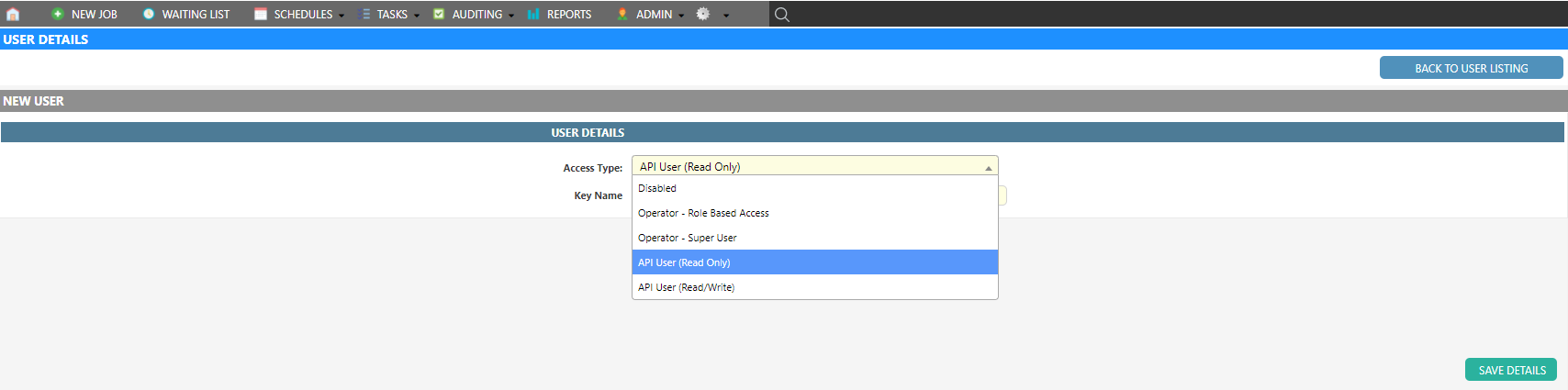 API Credentials are managed through ASAP operator/user screens where we have two API access options. Read Access Only and Read and Write Access.