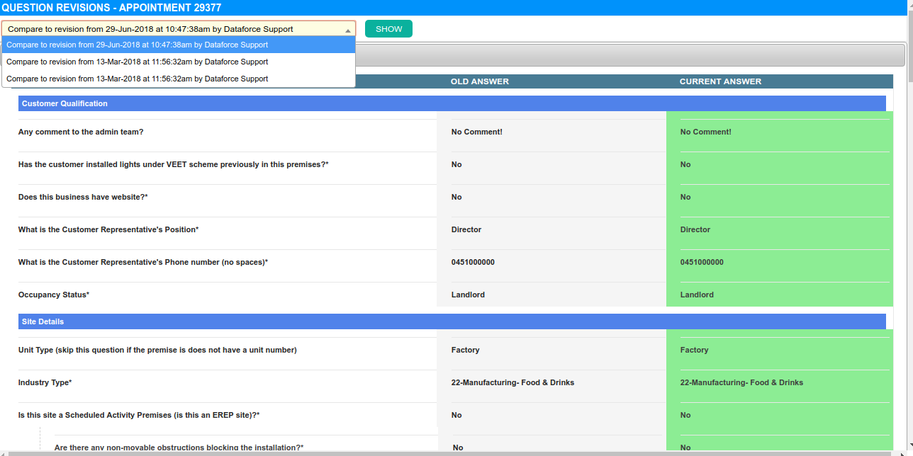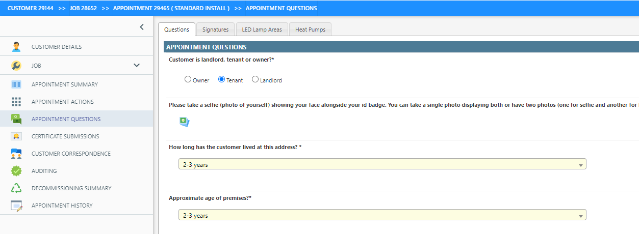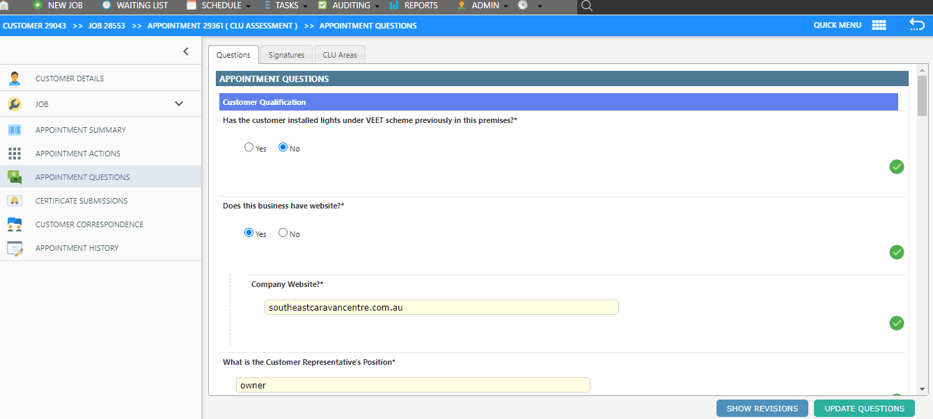 If the appointment status is Audit, Submitted or Invoiced then a normal operator will be unable to save changes to the questions.