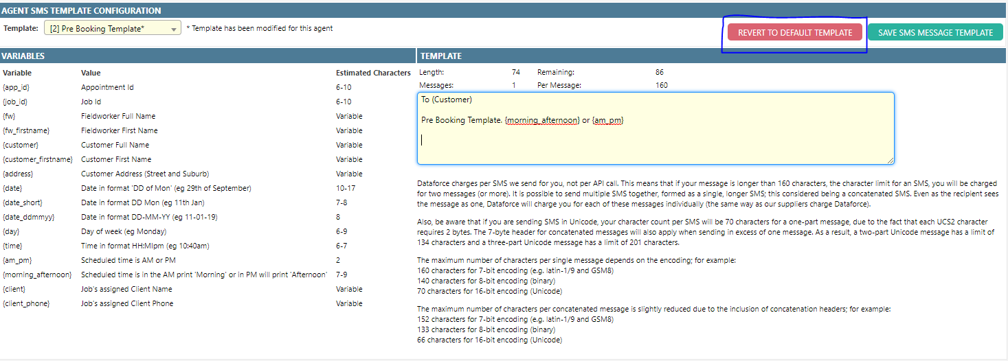 Insert your alterations to the template in the large text box, then press the green Save SMS Message Template button on the top right of the window.