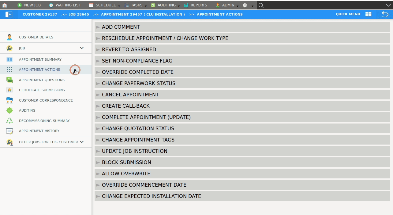 - Navigate to the Appointment Actions screen using the left sidebar that appears when inside an appointment.