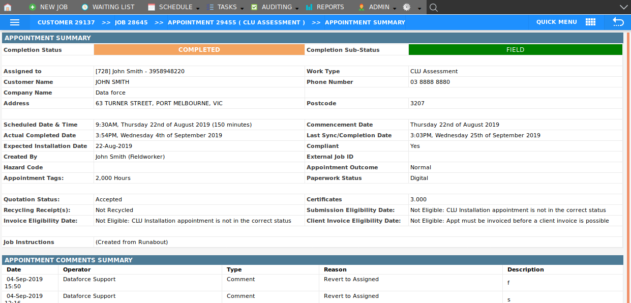 Once selected, the appointment can be scheduled to a field worker or added to the waiting list to be scheduled later.