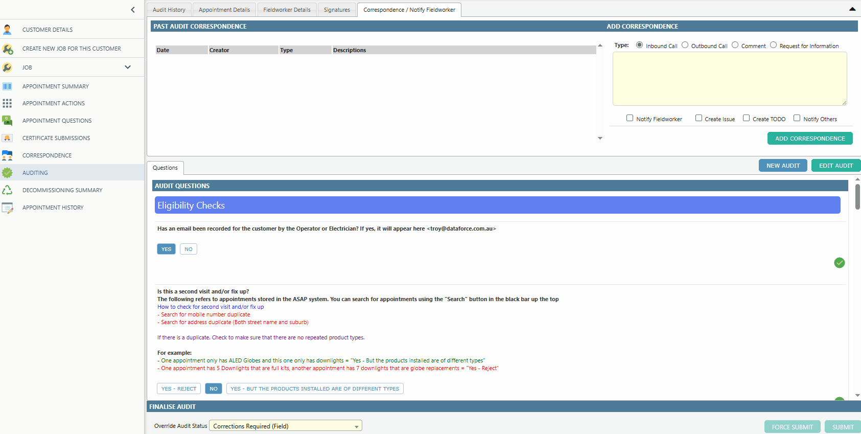 Over-riding the Audit Status allows the operator to select “Corrections Required (Field)” status, giving the fieldworker the opportunity to amend any errors