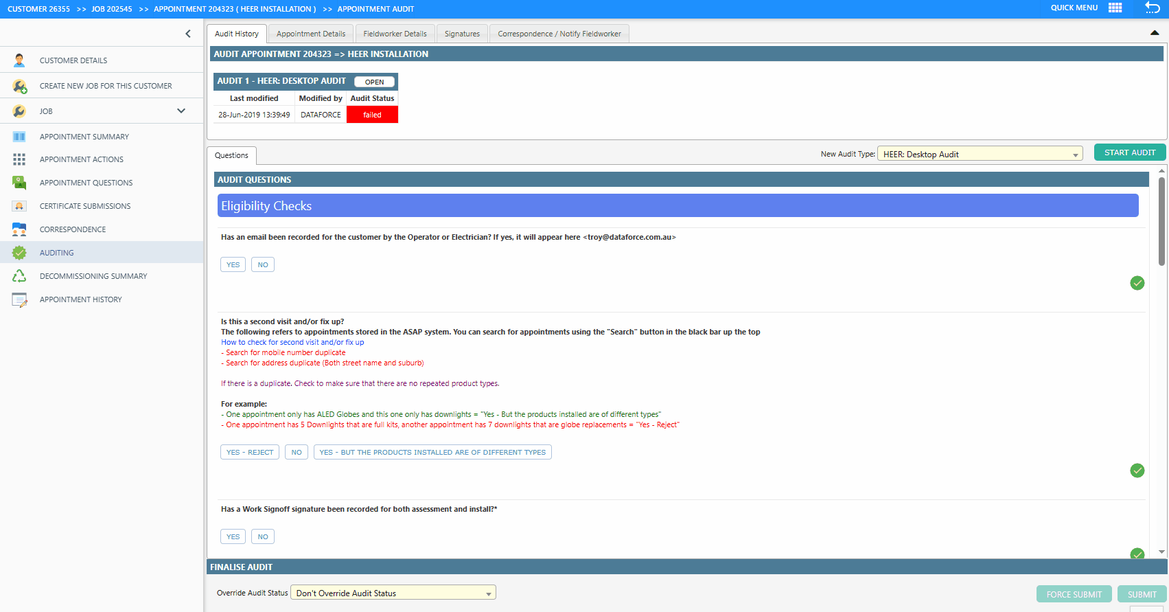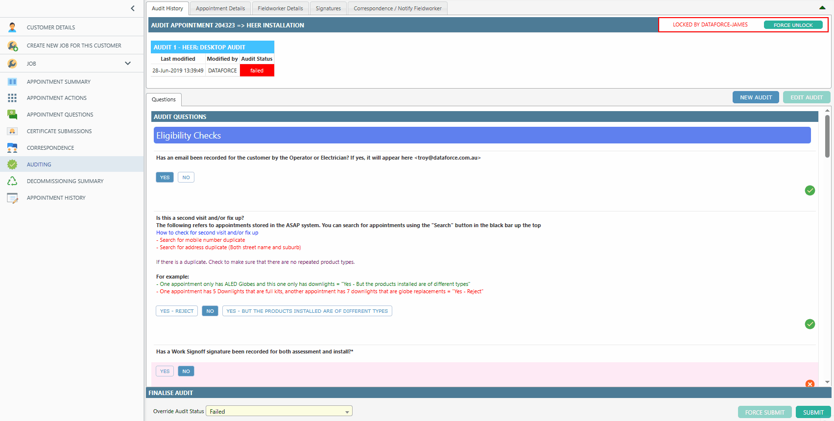In the audit process, when a fieldworker provides incorrect or missing information during the initial appointment, the auditor can over-ride the status of the audit to “corrections required.”