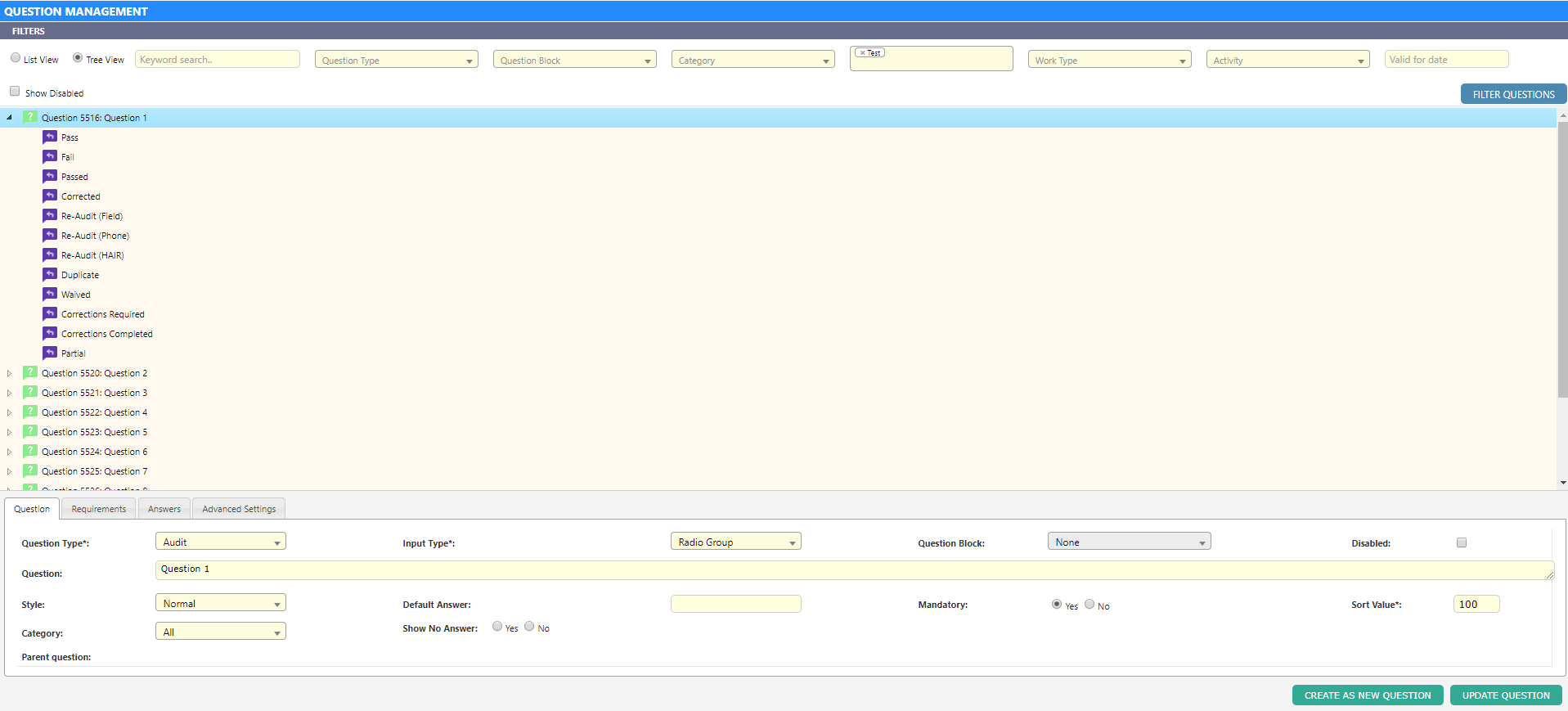 Within Dataforce ASAP, an audit question is simply a question with a type of audit. Audit questions can be managed in the same method as other Dataforce ASAP questions such as appointment or customer questions.