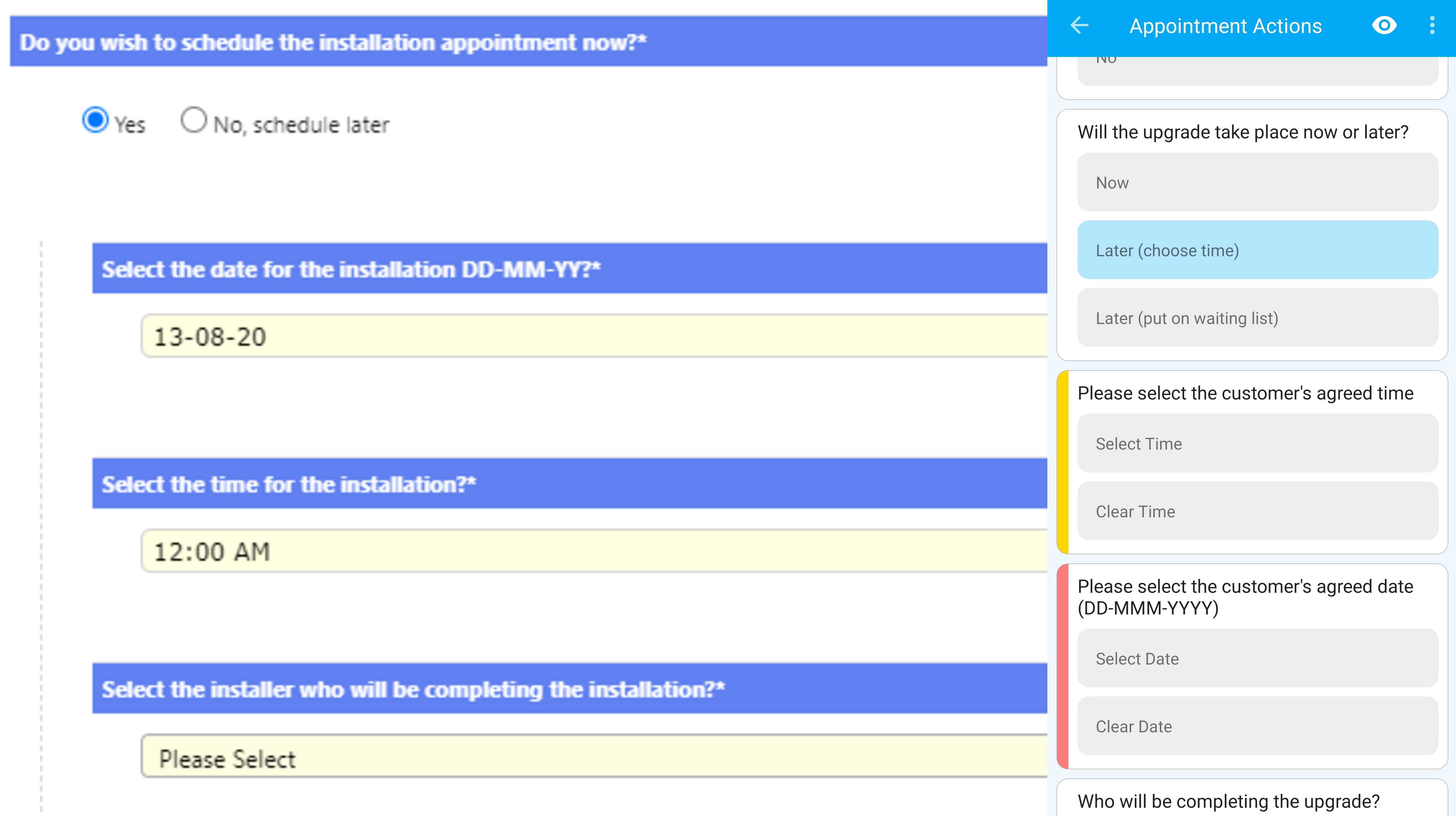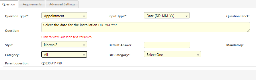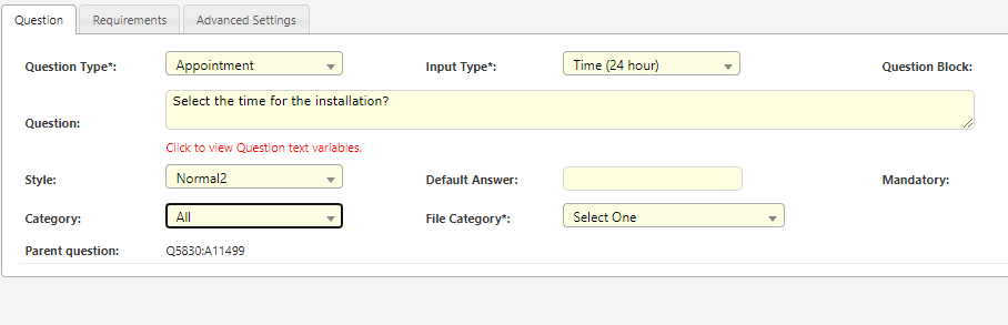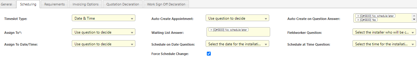| Assign to Date/time | Ask when the appointment should be scheduled. | -Use Question to decide: Ask for the time & date. - Minutes after parent appointment: Appointment is scheduled after the initial appointment. - Either of the above (questions takes priority): Field worker can choose to complete the job now or book in at a later time. |