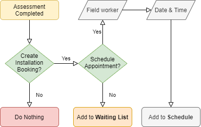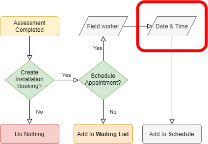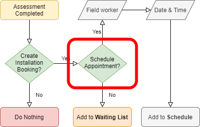- This is done through questions after an assessment is completed. These questions are configured under the scheduling tab on the appointment’s work type and allow Field Workers or operators to schedule an appointment without a manual scheduling process.