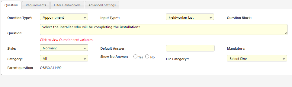 - The image below is an example of the questions settings which can be used for Selecting the Field worker.