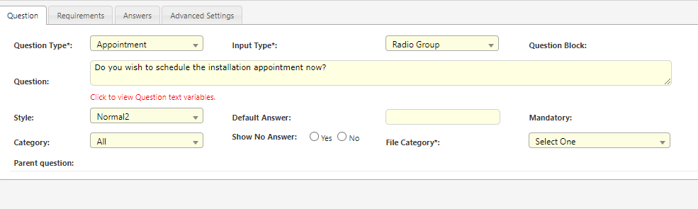 | Schedule at Time Question | The question in the parent appointment which requests for the time to automatically schedule an appointment of this work type. | Questions that ask for a date in the parent question will appear in the drop down box. |