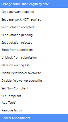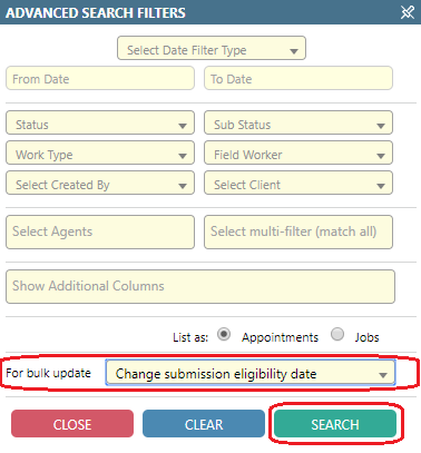 - Select an operation from the for bulk update list; this will filter out any appointments/jobs that cannot undergo the selected operation. If you’re looking to apply a job bulk action, you will need to first select the job’s radio button in the list as field.