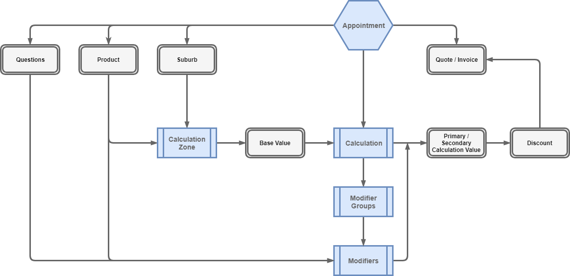 - Calculation Zones - A link between the calculation type, product and appointment’s suburb.