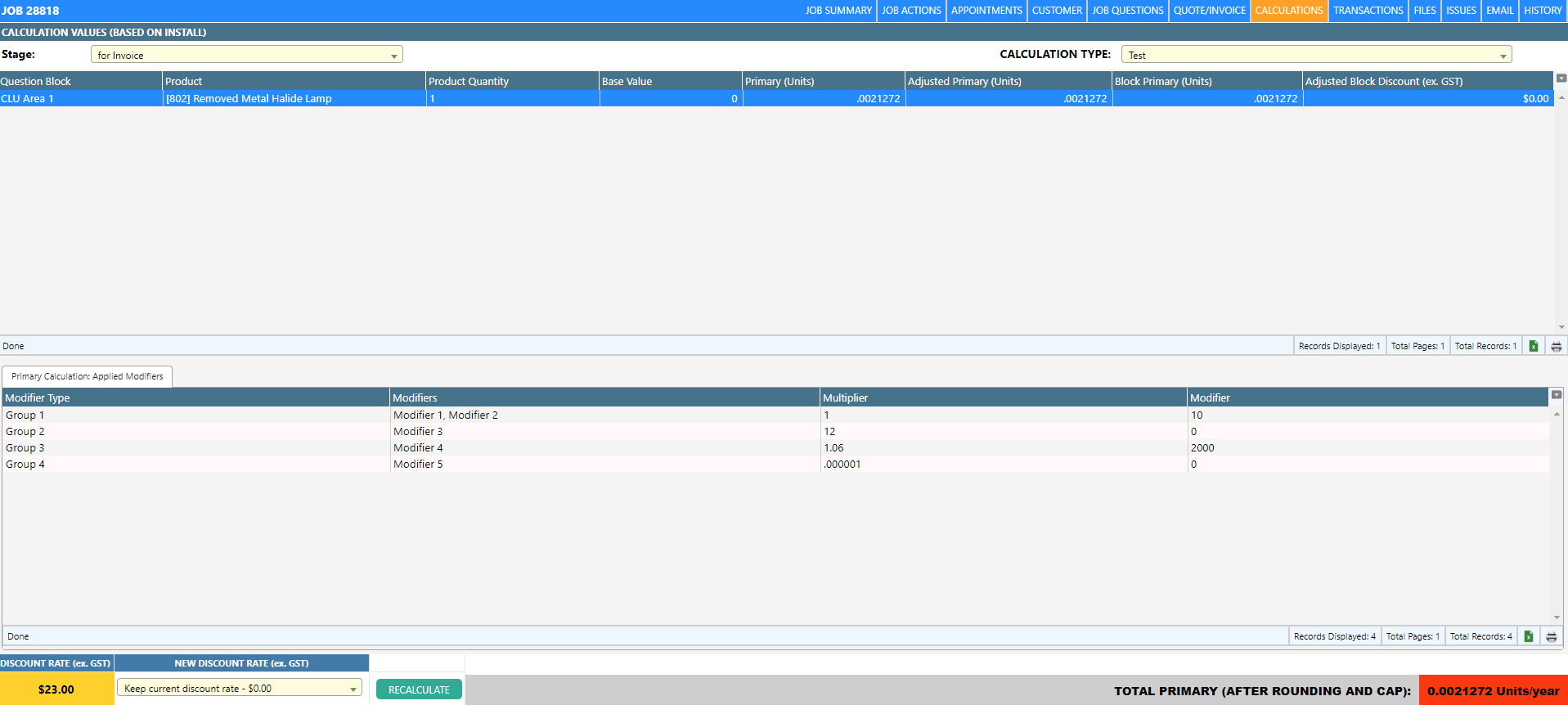 If enabled, a calculation’s current rate (i.e. discount rate) is visible at the bottom left of a job’s calculations tab. This rate can be defined in three places throughout Dataforce ASAP: