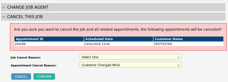 - Click the Confirm button to cancel this job and its appointments.