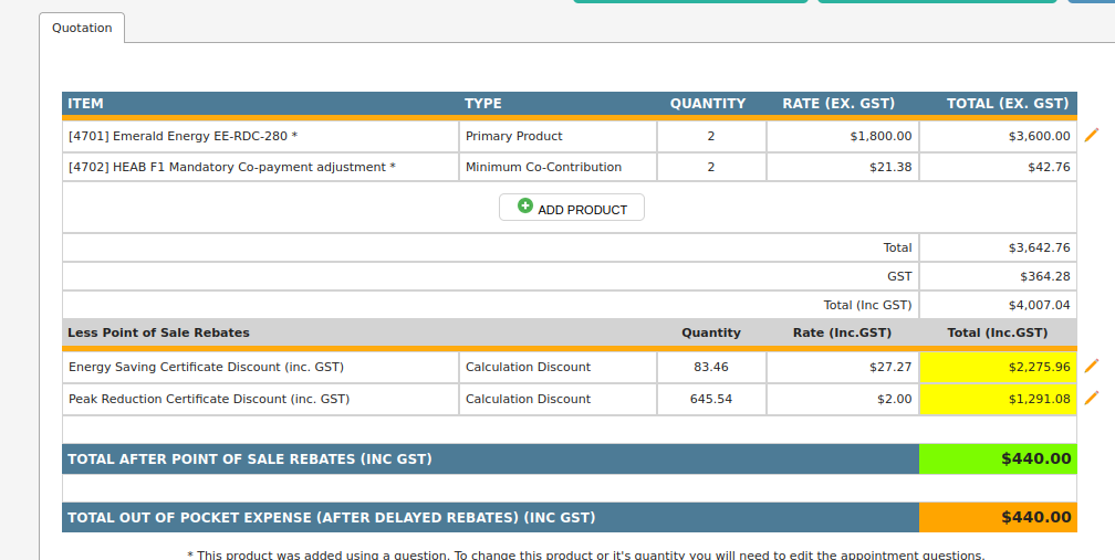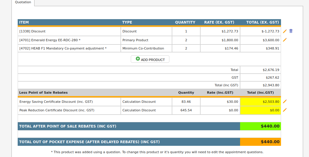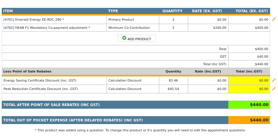 The customer cost before discounts is $9,680 incGST the Certificate Discount is only $2,275.96 incGST leaving more than the minimum required of $440. The Co-Payment has adjusted itself down to zero as its not required.