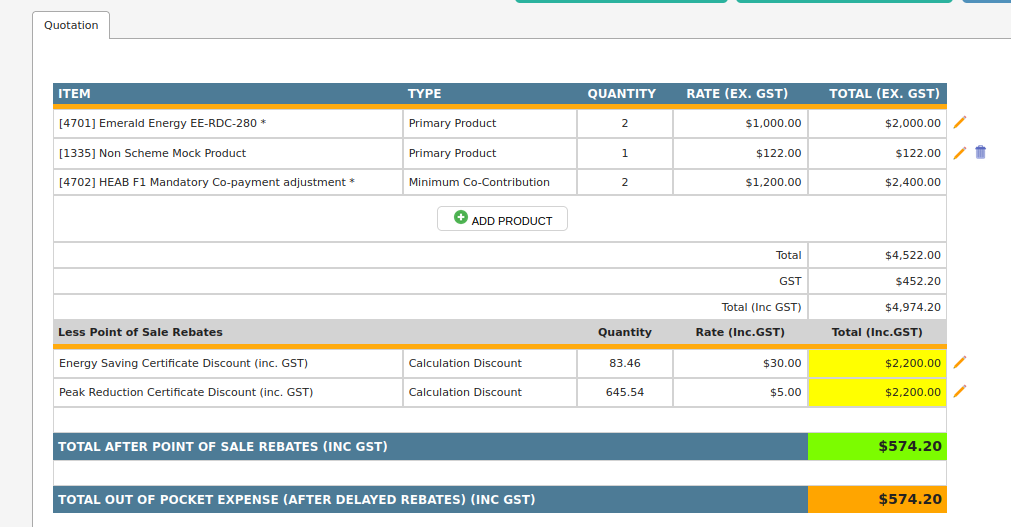 In this example the Certificate Discount totals $2,200 incGST and the cost of the Scheme Product is $2,200 incGST, so without the Co-Payment this job would be free.