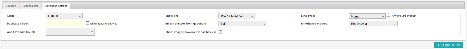 NOTE: This will not check through block questionsWithin Appointment Only Determines where the duplicate check should search for duplicate answers; if not selected, the search will check all jobs Inherit Answer from Question Where to retrieve an answer that will be filled before the question is answered. Self is default Inheritance Method How to fill the question before answering Audit Product Count This option will compare the answer value with the amount of whatever is selected in this field. If they do not match, Dataforce ASAP will fail the current audit. Share Image Answers Over All Blocks This option allows image questions to pre-fill the image if the image has been supplied in another block.