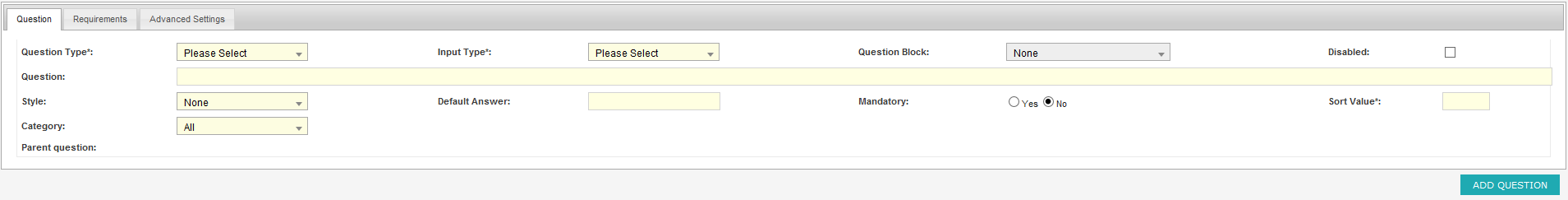 Property Description Question Type The type of question, which can be job, appointment, customer or audit Input Type How the question will be presented. (see Input Types) Disabled A method of soft deletion, which prevents the question from being displayed Style The question style - click the drop down to see a list of examples Mandatory A method of requiring the question to be answered Sort Value A method of sorting questions, 0 being the highest