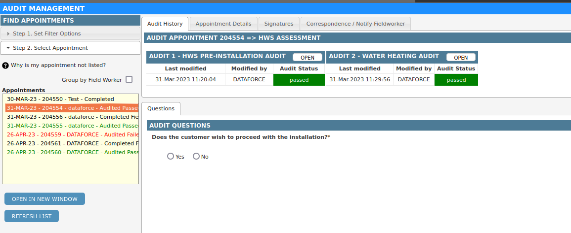This view allows the completion of multiple audits at once and provides the ability to build lists of appointments that require audits.