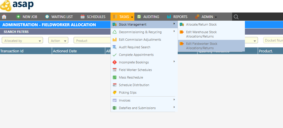Open the Administration - Field worker Allocation screen by clicking Tasks Stock Management Edit Field worker Stock Allocation/Returns.