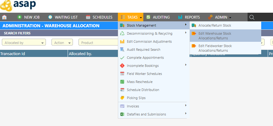 Open the Administration - Warehouse Allocation screen by clicking Tasks Stock Management Edit Warehouse Stock Allocation/Returns.