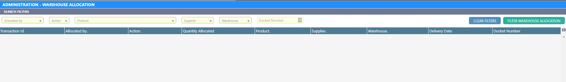 Select any necessary filters and click “Filter Warehouse Allocation” to find transactions that match with the selected filters.