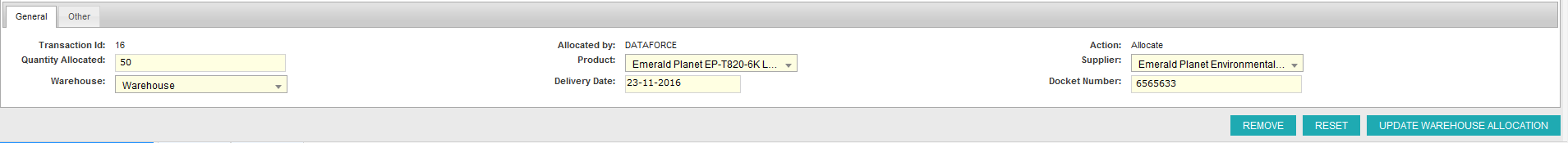 - Select “Update Warehouse Allocation” to update the transaction.