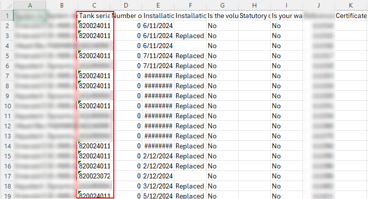 Excel converts serial and model numbers into scientific notation, which results in digits after the 15th being lost (replaced with zeros). This is an Excel-specific issue and does not occur if the file is never altered or opened in Excel.