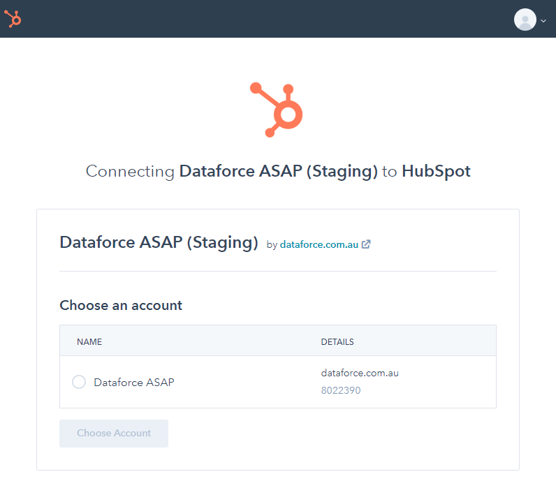 - This will take you to the HubSpot authorisation page. Select the HubSpot portal you wish to connect to, and the click Choose account