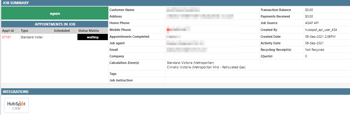 When inside a job in Dataforce ASAP that was created from Hubspot, the Job Summary screen will display a HubSpot CRM logo under the Integrations section. You may click on this logo to open the associated HubSpot deal.