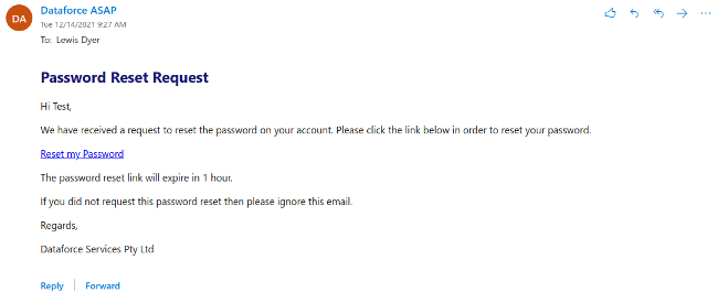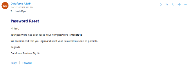 If successful a message is displayed ‘A password request email has been set to xxxxx@xxx.com.au’.