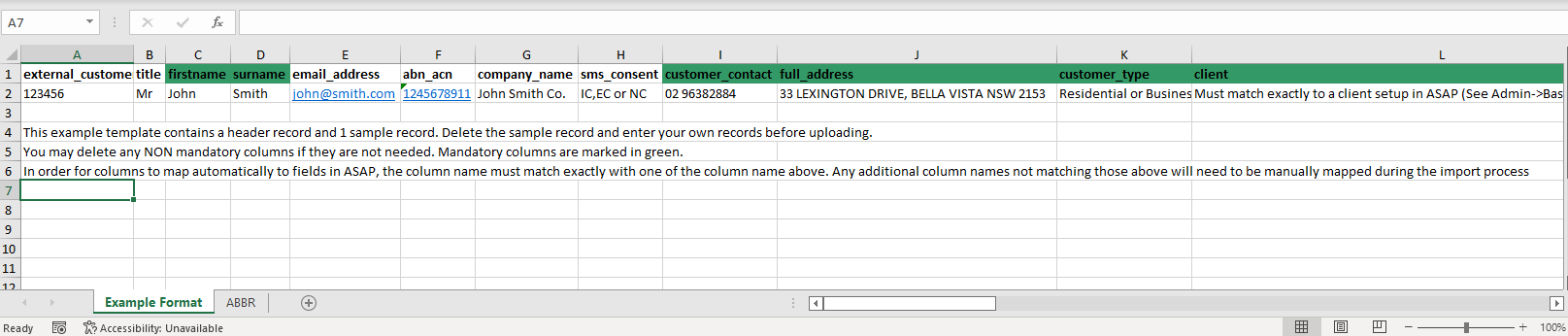 Dark green labelled headers are required fields. Instruction (rows 4-6) rows must be deleted before submitting