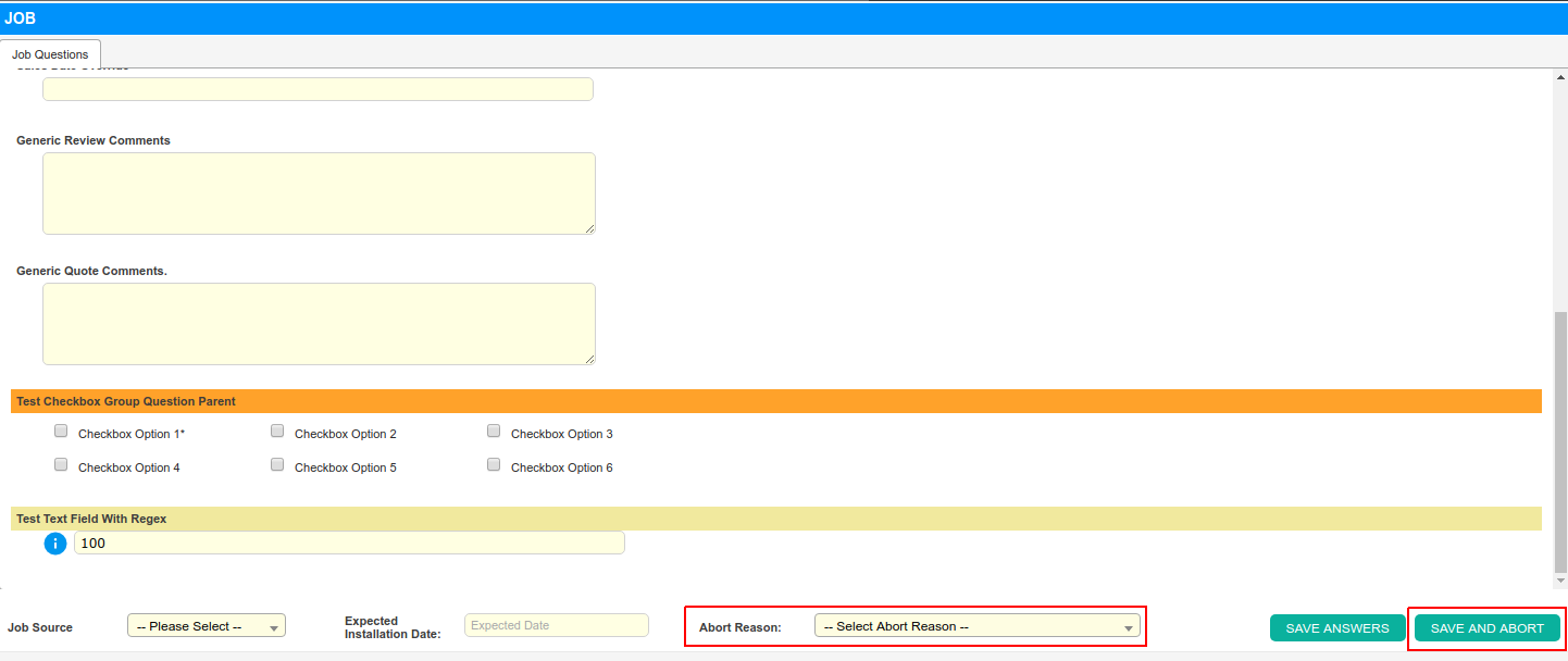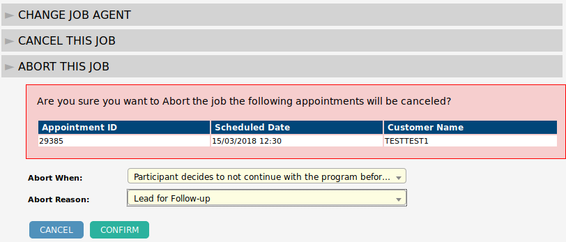 Abort job actions are used during the job creation process before any appointments or quotes are issued. These represent jobs which will not proceed. Canceling a job is also an effective method to stop progress, but to cancel a job, the creation process must be finished.
