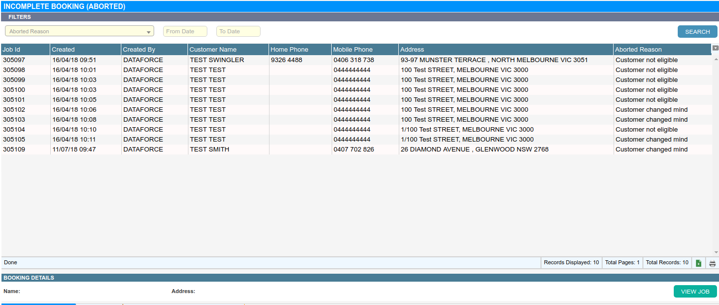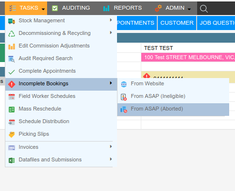 To find aborted jobs, a specialized screen is provided from Tasks > Incomplete Bookings > From Dataforce ASAP (Aborted)