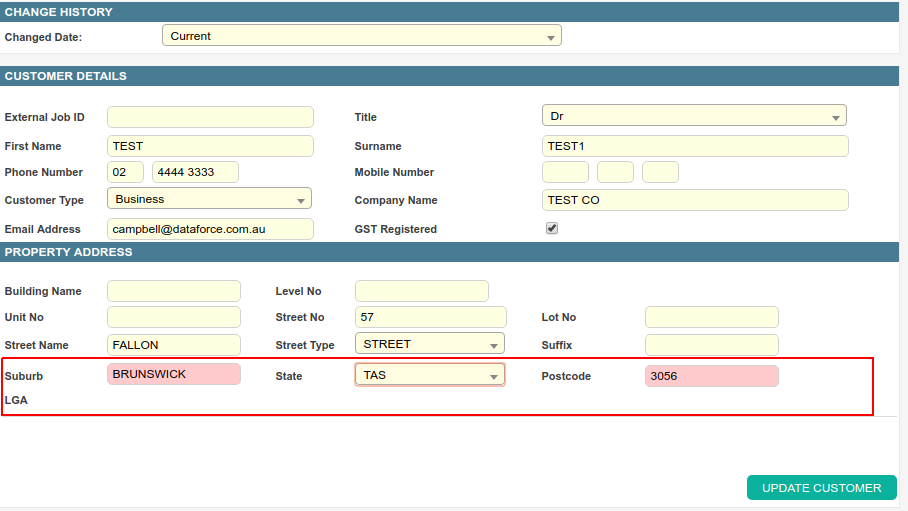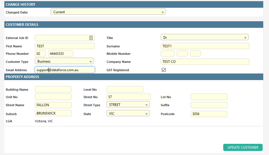 Once created, a customer’s details can be updated through a job’s customer tab.
