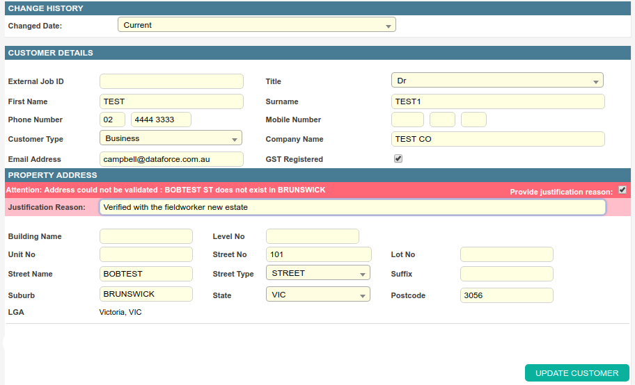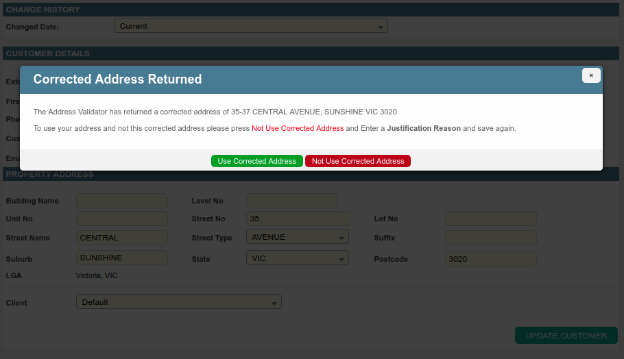 To save this justification, the operator must click the update button again. Once a justification reason is supplied, the address validator will not be run.