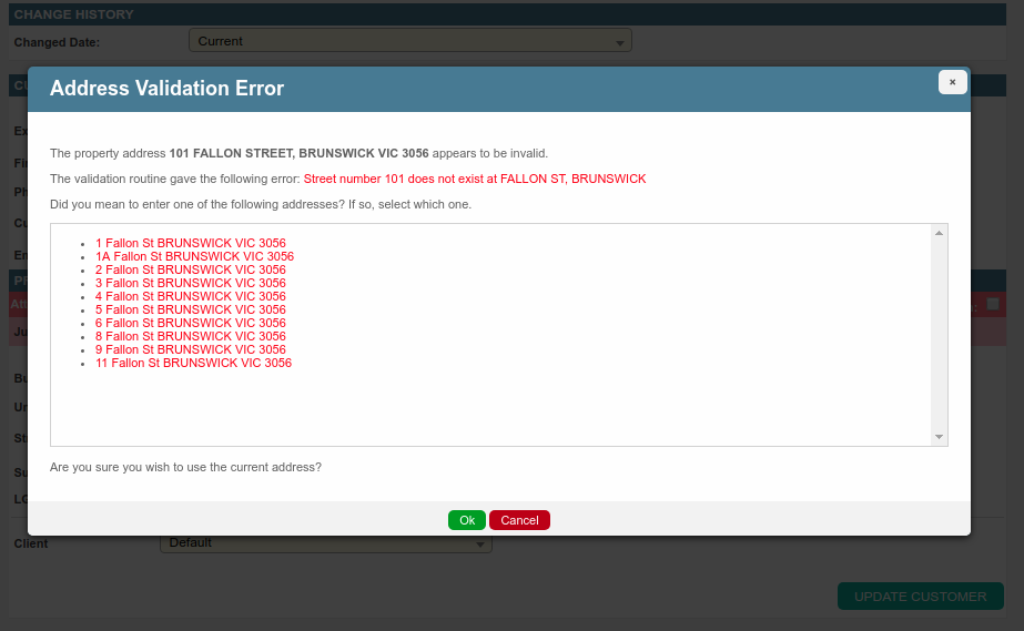 The above screenshot is returned when the address is invalid and there are no suggestions. An operator can continue with the current address or click cancel to change the details and try again.