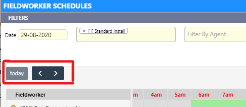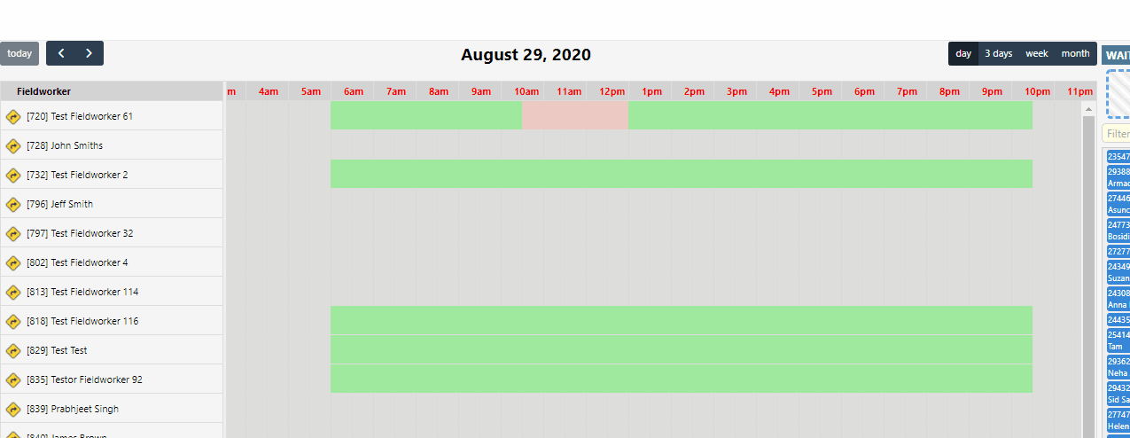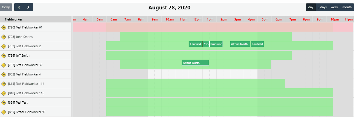 - Field workers selected in the filter are listed to the left side of the page. Their schedules for the day are then shown horizontally throughout the day.