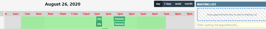 - On the right of the page, the waiting list will appear with all Appointments listed with no booking set. Click and drag the appointment to the desired time slot. The duration of the time slot is determined by the time set on the work type.