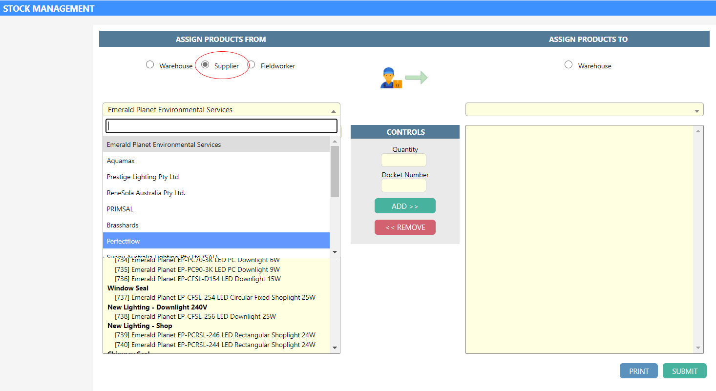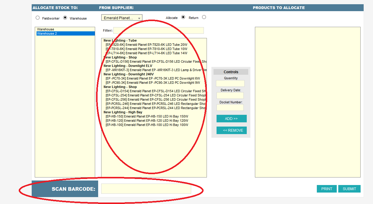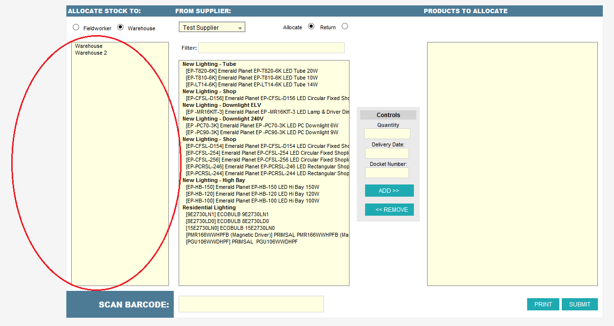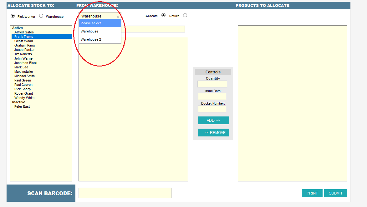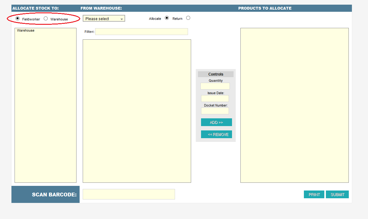Select “Allocate” if the product will be allocated to Field Worker or select “Return” if the product will be returned back from Field Worker to warehouse.
