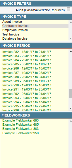 Invoice Period - A list of invoice weeks, the colour changes mean:
