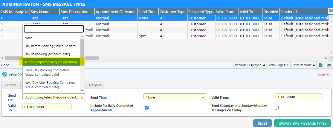 Under the options tab for the SMS Type, select “Audit Completed (Require Question)” for the “Send On” option