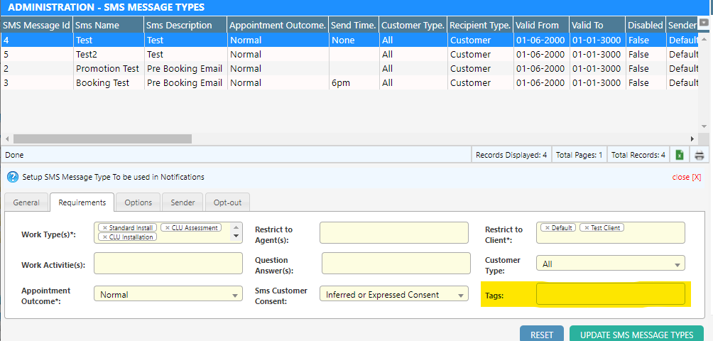 Tags can now be linked to SMS Types through the SMS Message Types screen. This allows you to filter the appointments sent by that SMS Type by one more tags.