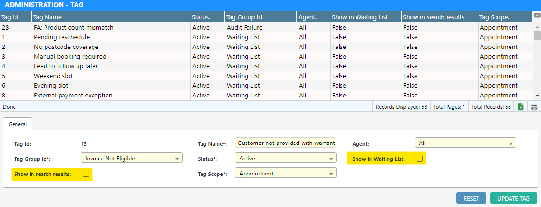 Two new check boxes have been added in the Tags configuration screen which enable tags to be shown in the Waiting List and Search Results as columns.