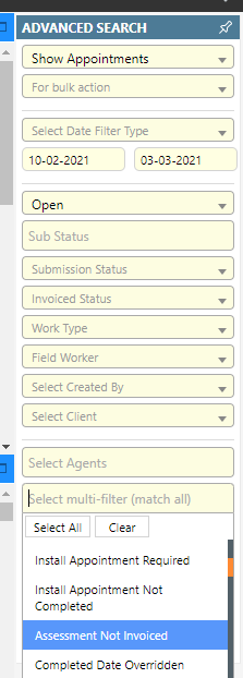 Added new search criteria ‘Assessments Not Invoiced’ to the Advanced Search Bar under the multi- filter dropdown. This will allow filtering on appointments where the assessment work type in the job has not been invoiced.