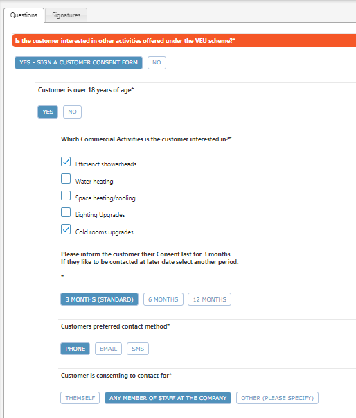 New questions will be added to capture the required details to completed the consent form. These are intended to be completed by door knockers or installers on site with the customer. We expect that these questions will be retired on 30th July 2024 when the door knocking bans come into place by the VEU. These questions are intended as an interim measure to help you capture customer consent while door knocking is still allowed under the VEU scheme.
