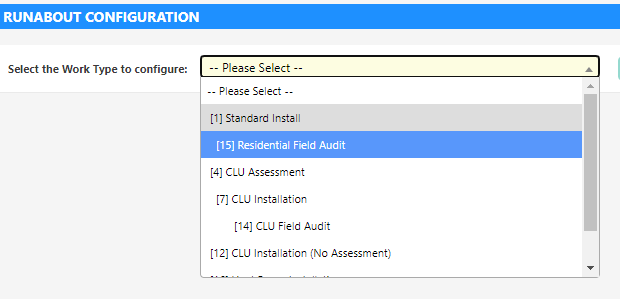 - Each work type that exists has a corresponding Runabout Menu and can be viewed/edited by selecting the Work Type from the drop down box in the Runabout configuration menu.