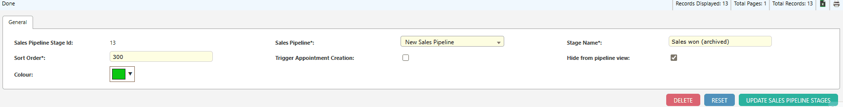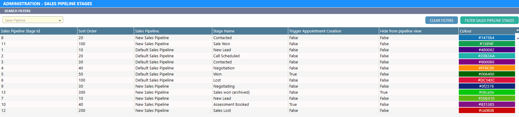 Field Description Sort Order Sort the sales pipeline stages in ascending order Colour Colour for the sales pipeline Stage Sales Pipeline Select which sales pipeline is related to this stage Trigger Appointment Creation Trigger the creation of an appointment when a lead lands on this pipeline stage Stage Name The name of the sales pipeline stages Tip: The Sort Order field in a Sales Pipeline will determine the order in which the stage appears in the Sales Pipeline