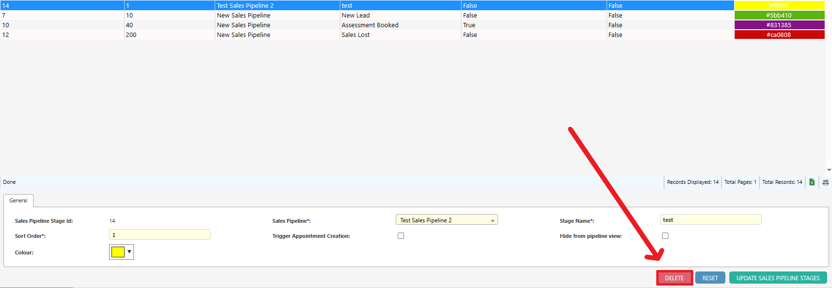 To delete a Sales Pipeline Stage