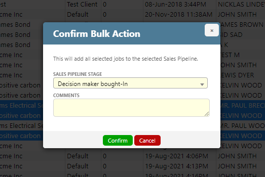 - Select the required Sales Pipeline Stage, enter a comment and click ‘Confirm’