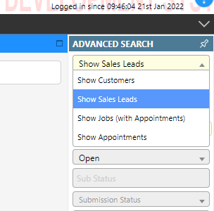 - In advanced search, select ‘Show Sales Leads’ from the select first dropdown list immediately under the ‘Advanced Search’ title